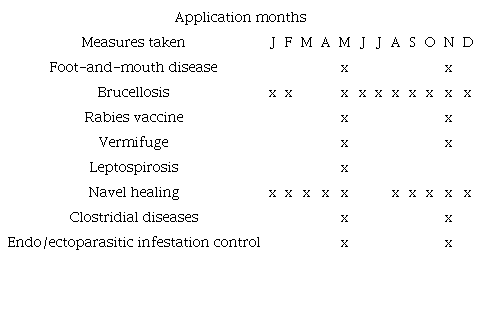 The farm uses prophylactic measures such as vaccination against foot-and-mouth disease, brucellosis, clostridial diseases, measures to control endo/ectoparasitic infestation such as horn flies and ticks, and tuberculosis examination (Table 3). Newborns are observed for one to check if they are healthy and feeding on their mother’s colostrum. They also receive the necessary care, such as having their navel cut and sterilized with 10% iodine, weighed and identified; these measures are related to the prevention of diseases that might affect these animals in the future.