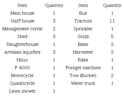 The farm has accommodation and a dining hall for employees, two management centers, in addition to machinery, equipment, vehicles used in livestock production and a slaughterhouse for internal consumption (Table 4).