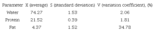 The basic chemical composition of the examined muscles was characterised with an average content of water 74.27%, protein 21.52% and fat 4.37% (Table 1). The contents of protein and water showed low individual variability, whereas in the case of fat, there was marked a significantly greater variation. The average fat content was 4.37%, but the variation coefficient was high, around 35%. Fat in beef is a labile ingredient, due to high individual variability. It is the ingredient associated with the outer meat or the creating of marbling. Individuals of the same breed, fed and kept under identical conditions may show different marbling of meat. A similar content of water and protein, and lower by 2% content of fat, characterised the longissimus thoracis muscle studied by Fabre et al. (2018) in comparison with our results. Fat content was characterised by a significantly greater variability in relation to protein and water. Results obtained by Wajda, Daszkiewicz and Piotrowski (2004) confirm the highest variability in the case of the fat component. Due to the cross-breeding of the black-and-white breed with meat breeds, the authors obtained, however, higher variation in protein and water contents.