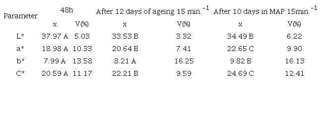 The colour of the examined dorsal muscle was characterised by the average surface’s brightness, L*=37.97 and cross-section’s, L*=32.97. The determined values had similar variability. The average value of muscle surface’s ‘redness’ was a*=18.98, whereas cross-section’s was greater by approx. 1.3 unit. The parameter of ‘yellowness’ b* of muscle surface was averagely b*=7.99. A slightly higher value of ‘yellowness’ was noted for the muscle cross-section. The calculated values of colour saturation C* were for the surface C*=20.59, and cross-section C*=22.13, along with similar individual variability, (Table 3 and 4). Dorsal muscle is located in the exposed part of carcass, hence cooling is evenly distributed, the pH changes between layers are not significantly differentiated and colour rings do not form as in the case of muscles located deeper in the carcass, e.g. leg muscles. Hence, such a small demonstrated variability of pH and colour parameters. The significant dependence of colour on the pH value of meat was noted by Abril et al. (2001). The parameters of meat colour underwent significant changes as a result of ageing process and storing in MAP. The surface of meat was characterised with a significantly lower brightness L*, and higher value of ‘redness’ a*. As a result, the saturation of colour significantly increased its value. A further increase in the chromatic values a* and b* during storage in MAP storage led to the increased saturation of colour C* by more than 2 units (Table 3). In the case of muscle cross-section, the scope of these changes was different. It is worth emphasizing that the value cross-section’s ‘redness’ was significantly higher in comparison with the surface of meat. As a result of ageing, the a* value increased by more than 3 units, and while storing by further 4 units. These changes had a decisive influence on the increase in the colour saturation C* by more than 7 units (Table 4). Similar trends in the changes of colour parameters can be observed in the work of King, Shackelford, Kalchayanand and Wheeler, (2012).