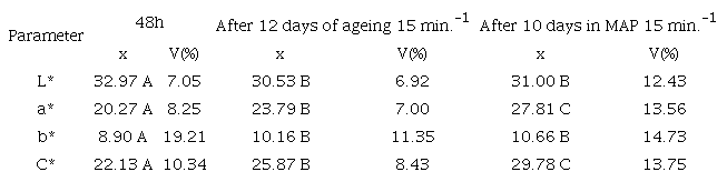 The variability of the obtained results was not much (V=1.95%), which proves balanced acidification in the whole mass of muscles, lack of significant individual differences resulting from the similar pace and extent of glycolytic changes. The obtained results prove the correct course of post mortem changes, in particular: the consumption of glycogen reserves, ATP decay and accumulation of lactic acid. The test material was free from quality deviations associated with the depletion of glycogen before slaughter. Incorrect acidification and defective meat occur most often as a result of ante mortem incorrect handling of animals, which also affects the tenderness of meat. Researchers drawing attention to these conditions include Florek, Litwińczuk, Skałecki and Ryszkowska-Siwko, (2007), Jelenikowa, Pipek and Staruch, (2008) and Cierach et al. (2009a). Many meat processing plants are considering or already using subsidies to prices for slaughter livestock, the meat of which, 24h post mortem reaches the pH value <5.9 as a result of the proper handling of the animals and guarantees obtaining meat without quality deviations. During meat ageing, there was observed a significant increase in the pH value to the level of 5.98 and a slight - statistically insignificant, along with the adopted confidence coefficient - the decrease of the value to 5.90, during storing in MAP (Table 2). The increase in the water holding capacity of meat after the disappearance of cold shortening is closely related to the degradation of myofibrillar protein, the loosening of actin-myosin complexes and the increase of meat’s pH value during ageing. The increase in the water holding capacity of meat contributes to the improvement of meat’s tenderness (Huff-Lonergan & Lonergan, 2005; Jelenikowa et al., 2008).