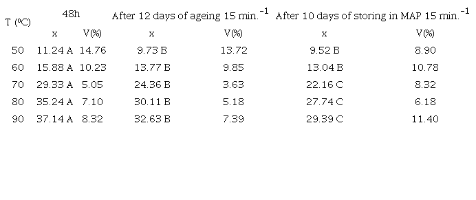 The amounts of heat leakages were greater along with the increasing of temperature from the level of 11.24% (50°C), to the level of 37.14% - for temperature 90°C. In the range of 60 - 70°C the increase in the size of the heat leakage was the highest, and slightly smaller in the temperature range of 70 - 80°C (Table 5). These were temperature ranges, in which there occurred intensive denaturation of myofibrillar proteins, hence their decreasing water binding capacity and increased heat leakage. The highest variability of the results was noted for the temperature of treatment 50 and 60°C, and then there was observed a significantly higher repeatability of results. Due to the ageing of meat in vacuum packages and further storage in modified atmosphere, there were obtained significant, statistically vital, decrease in the sizes of leakages. Along with the increase in the thermal treatment temperature, there was more intense the beneficial effect of smaller leakages. At the temperature 50 and 60°C, there was obtained the decrease in the leakages sizes by approx. 2-3%, and in the temperature 70, 80 and 90°C, by approx. 7-8% (Table 5). Vacuum ageing had a greater impact on the reduction of leakages than the storing of meat in MAP, which could be linked to the shaping of meat’s pH values, higher after ageing than after storing in MAP (Table 2). The reduction of heat leakages, by approx. 4%, due to the conditioning of meat for 14 days was also obtained by Silva, Moura, Ramos, and Ramos (2017). The next 14 days of meat conditioning did not lead to significant reduction in the size of heat leakage (Silva et al., 2017). The size of heat leakages is influenced, beside time, temperature, meat’s pH values, by denaturation changes of protein responsible for water binding and disintegrative changes within cytoskeletal proteins, causing the contraction of muscle cells, which results in the movement of water to extra-cellular spaces (Huff-Lonergan & Lonergan, 2005; Yancey, Wharton, & Apple, 2011; Kemp & Parr, 2012).