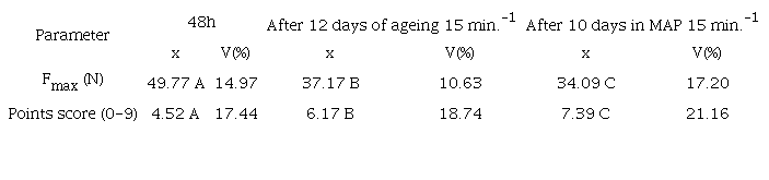 As a result of the conducted shear force test, it was found that the initial, before ageing, average shear force of the m. longissimus lumborum samples was 49.77N (Table 6). Belew, Brooks, McKenna and Savell (2003) showed in their studies that the supporting muscles (e.g. m. longissimus lumborum) are often less tender than dynamic muscles (e.g. m. semimembranosus). In the case of studied m. longissimus lumborum steaks, there was obtained shear force at the level of Fmax=49.77 N, which was reflected in the relatively low score for tenderness amounting to 4.52 pts (1-9 scale) in the organoleptic evaluation (Table 6). Quite different values of shear force were obtained by Palka and Kołczak (1998). The longest dorsal muscle of young bulls was characterised by almost twice as big shear force (86.7 N) in comparison with the results obtained in this experiment. The cited authors did not obtain confirmation in the sensory evaluation of the instrumental tests (Palka & Kołczak, 1998). Destefanis, Brugiapaglia, Barge and Dal Molin (2008) achieved high correlation of sensory evaluation test results with the ones obtained from the test of shear force by means of the Warner-Bratzler blade. These authors determined that the beef meat of shear force F >52.68 N is considered by consumers as hard and the one of F <42.87 as tender (Destefanis et al., 2008). After 12 days of ageing, there was achieved the decrease in the shear force from 49.77 to 37.17 N, and after next 10 days of storing in MAP the shear force was averagely 34.09 N (Table 6). Simultaneously, in the consumers’ evaluation of tenderness, the score was successively higher. As a result, the final score was shaped at the level of 7.39, and Fmax=34.09. Due to the conditioning of Brazilian beef for 28 days (m. longissimus thoracis), Silva et al. (2017), achieved the decrease in the shear force by approx. 50%, despite not applying increased temperature in the post mortem ageing process. These authors, applying two different methods of preparing samples to the shear test, achieved in both cases a high correlation coefficient with the sensory evaluation. In the conducted experiment, m. longissimus lumborum meat shall be considered as tender, all the more, there were examined samples with a bigger diameter than in the cited references. In turn, according to Belew et al. (2003), ‘very tender’ meat has shear force below 32 N, and ‘hard’ above 46 N. The classification applies, however, to meat from carcasses described by the American system of evaluation as ‘Choice’ or ‘Select’. Conducting the classification of different beef muscles by sensory and instrumental evaluations Hildrum et al. (2009) expressed a view that the longest dorsal muscle should not be a point of reference to the evaluation of muscle profile of the whole carcass because other muscles show significant differences in tenderness.