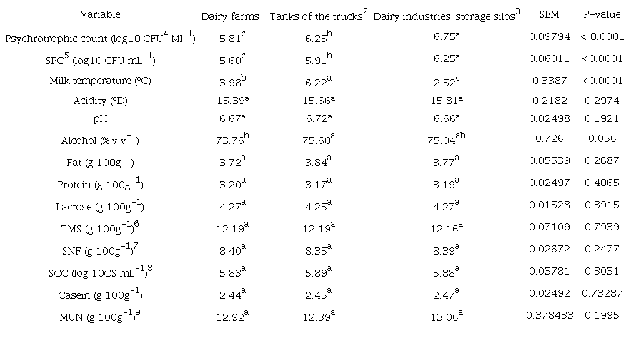 There was a difference between the average milk temperatures (Table 1), with an average increase of 2.24ºC between the dairy farm and the isothermal tanks of the trucks (moment of unloading) and a decrease of 1.46ºC from the truck's tanks to the silo of the industry. The milk receiving temperature is within the limit recommended by IN 76, of 7.0°C (Instrução Normativa nº 76, 2018). Although, storage at 2°C is the limit in which there is a reduction in multiplication and, consequently, in the counts of proteolytic, psychrotrophic and thermoduric microorganisms and the control of potentially pathogenic and deteriorating bacteria (Vithanage et al., 2016, 2017). Unfortunately, due to the legally established temperature limit and the lack of equipment refrigeration with these technical specifications, maintaining the milk produced in Brazil at temperatures as low as those tested in studies by Vithanage and collaborators is not yet possible. Therefore, the main focus on the technical guidelines and measures taken by the dairy farms must be on the control/reduction of the initial contamination of the milk.