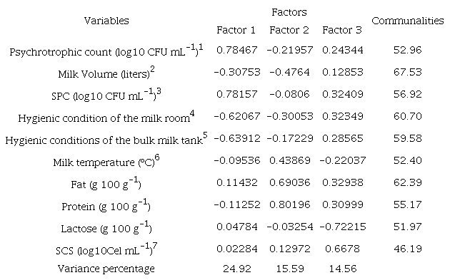 The factor analysis that evaluating the relationship among milk quality and hygiene in the storage room (where the bulk milk tank is), farm production, and milk storage temperature generated three factors (Table 2). The factors together explain 55.07% of the total variation. The communalities demonstrate the relevance of each variable used in this analysis. In factor 1, the psychrotrophic count and SPC showed a positive relationship between them, with a negative association with the cleanliness of the storage room and the bulk tank. With the relationships formed in factor 1, we can suggest that high SPC and psychrotrophic count are most common in milk from dairy farms with poor hygienic-sanitary conditions and poor structural conditions in the bulk tank storage room and in the bulk tank itself. Reche et al. (2015) found a strong influence (p < 0.0001) of the initial milk contamination on the total bacterial counts and psychrotrophic count. These authors reinforce the importance of good milk production practices by dairy farmers to obtain a product with satisfactory microbiological quality, which can be stored and transported and still reach desirable industrial processing characteristics.