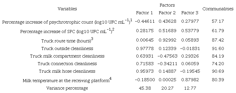 The second factor analysis evaluated the relationship between the bulk transport of raw milk and the quality of milk received by the industry. The three dimensions formed, explain the 78.42% of the total variation (Table 3). The first factor had the truck cleaning variables (external, compartments, connection, and hose) with the highest factorial loads and, positively correlated. These variables showed an opposite relationship with the percentage increase in psychrotrophic count during milk transport. The results presented in factor 2 reinforce the association found in factor 1, in which we observed a positive association between the time from the milk collection at the first dairy farm of the truck route, the percentage increase in the psychrotrophic count, and the percentage increase in the SPC.