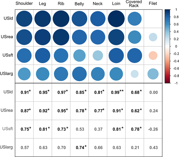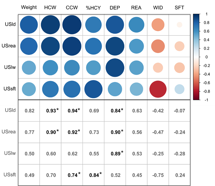 The positive and high-magnitude correlations found in the present study between USsft and HCY can occur because greater the deposition and proportion of fat in the carcass is associated with greater the carcass yield. This fact is best observed when comparing animals of different ages, where younger animals have less fat, and consequently lower carcass yield compared to older animals (Claffey et al., 2018). USld and USrea also obtained high positive correlations with carcass weights (HCW and CCW), which demonstrate that these measures can be used to estimate carcass or tissue yields.
