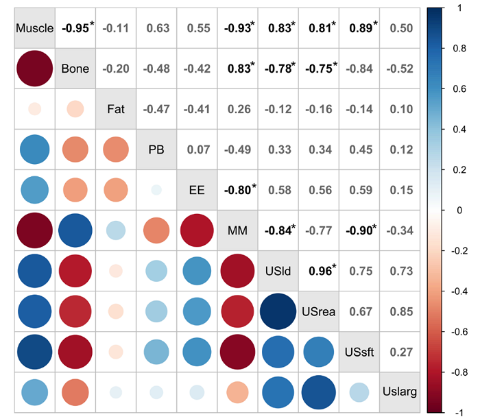 For the % muscle variable, high positive correlations were found between USld USrea and USsft. However, the correlations between bones (%) and the variables USld and USrea were negative. The ultrasound measurements did not show significant correlations with the physical-chemical data on protein and ether extract, but the correlations between the MM variable and the ultrasound measurements of USrea, USsft, and USld were also positive and high.