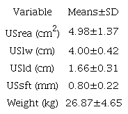 The means and standard deviations of the ultrasound measurements and the weight of the animals are shown in Table 1.