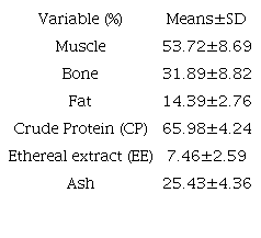 The study of Pearson's correlations showed that the only significant correlation (p < 0.05) between carcass components was between muscles (%) and bones (%). The bones have allometric growth characteristic, so that after the animal reaches maturity, they stop growing, not undergoing great variations due to external influences. In contrast, muscle tissue after maturity can vary depending on the management conditions and the physiological period and nutritional status of the animal (Paulino et al., 2009). The negative correlation between the components indicates that the greater the muscle growth is, the lower the proportion of bones in the carcass of the animals will be.