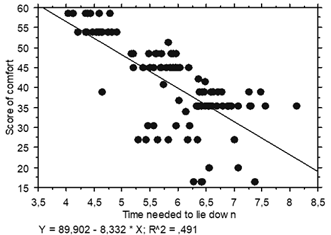 The longer lying time is mainly related to the quality of floor, especially hard or concrete floors, which cause cows to lie down less often, although this reduction can be partly compensated by a longer average lying time (Rushen et al., 2007). This finding is consistent with several studies that have shown that cows prefer soft floors to hard or concrete floors (Lidfors, 1989; Haley, de Passille´, & Rushen, 2001, Tucker & Weary 2001). Norring, Manninen, de Passille, Rushen, and Saloniem (2010) also showed that 80% of lying positions were observed on carpet and only 20% on concrete. Thus, the longer lying sequence, the more difficult it is for cows to lie down, which explains the alarm and warning thresholds found in the present study as well as the significant correlation detected between comfort around resting and time spent lying down (r = -0.70; p < 0.0001) (Figure 1).