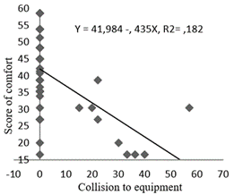 This state of discomfort and uneasiness is closely linked to the farmer's management: inadequacy of the lying area with cow movements, short and poorly placed tethering chains, slippery and unsuitable floor. Hence the significant correlation found in our study between the frequency of collisions and comfort (r = -0.43; p < 0.0001) (Figure.3).