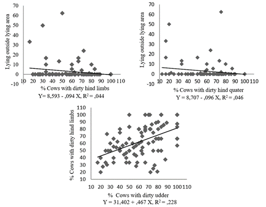 Regarding the cleanliness of dairy cows in our study, we found a high average prevalence of cows with dirty udders (62.6% ± 21.9), dirty hindquarters (60.6% ± 21.5) and dirty hind limbs (60.6 ± 21.4) (Table.1). As a result, a large number of farms exceeded the alert thresholds for these measures: 100.0% for udder cleanliness, 86.0% for hindquarters cleanliness and 63.0% for hind limbs. This high level of uncleanliness indicates serious problems of welfare. Our results are in agreement with those of De Boyer des Roches et al. ( 2014) in France, who noted a high proportion of farms exceeding the alert thresholds: Hind legs (95.4%), hind quarters (93.9%) and udders (70.7%), which explains the correlations found between cows with dirty limbs and those lying outside the lying area (r = 0.21 ; p = 0.03), dirty udders and dirty limbs (r = 0.21; P = 0.03), as well as cows with dirty hindquarters and those lying outside the lying area (r = 0.21; P = 0.003) (Figure 4).