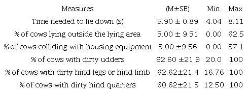 The presence of cows lying outside the lying area is also a resting comfort criterion, which generally reflects a mismatch between the lying area and the size of the cow. This problem exists with varying frequencies not only in Algerian farms (3.00±9.31) (Table.1) but also in other countries: Popescu et al. (2014) (3.19%), De Boyer des Roches et al. (2014) in France (0, 34%); Silva (2013) in Portugal (20%).