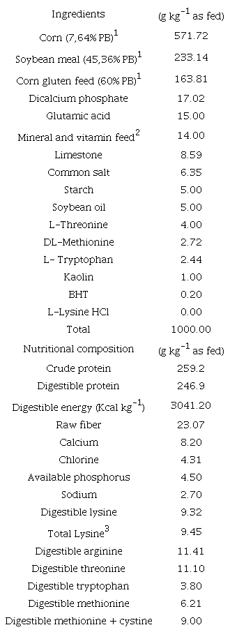 The nutrient contents of the basal experimental diet were according to Furuya (2010), except for total and digestible lysine. The chlorine and sodium requirements were obtained from the NRC (2011). For methionine + cysteine, the contents used were estimated by Michelato et al. (2013), who worked with tilapia weighing between 550 and 700 g. Chemical analyses of the ingredients and diets were performed in the Nutritional Science Laboratory in the Animal Nutrition and Pasturage - IZ - UFRRJ.