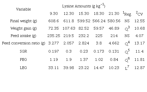 Data were interpreted by variance analysis at 5% probability with the use of the software SISVAR - Variance Analysis System - version 5.4 (Ferreira, 2010). The statistical assumptions of homogeneity and normality were attended. The effects on the relationships with increasing amounts of lysine were analyzed by quadratic or linear regression models, depending on the best adjustment determined for each variable.