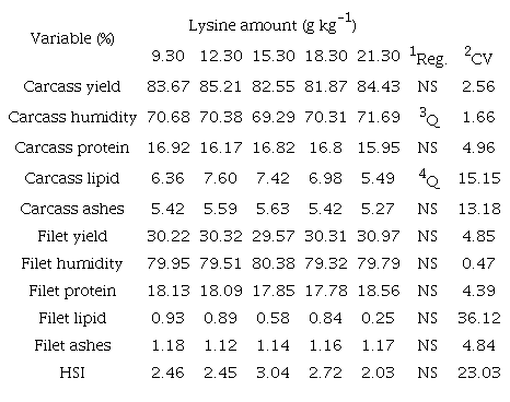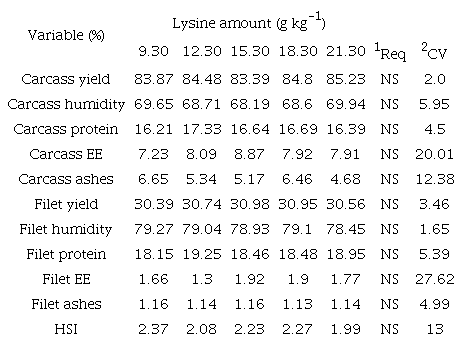 The rationed lysine levels influenced carcass humidity and ethereal extract. Since there was no difference in fillet humidity and ethereal extract, those differences observed in the carcass could be due to filleting residues and fish skin. Tilapia filleting residues have high fat contents, derived mostly from the offal (Boscolo, Hayashi, Feiden, Meurer, & Signor, 2008).