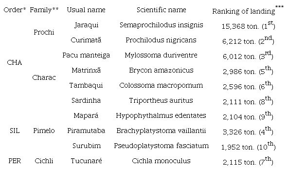 The proximal composition of the 10 fish species with the highest landing volume in Amazonas State (curimatã, jaraqui, mapará, matrinxã, pacu, piramutaba, sardinha, surubim, tambaqui, and tucunaré) varied widely between species and seasons, where fishes in the flood season presented better nutritional composition than drought season. This result also was observed in minerals profile, where fishes in the flood season presented highest minerals (macro and minerals) content than drought season.