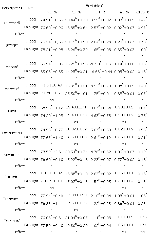 The protein content results in all species evaluated were little affected by hydrological cycles, including some species (pacu, piramutaba and tambaqui) that were not present a significant effect (p > 0.05) of hydrological cycles on their protein content. The fillets of all species evaluated presented a significant effect (p < 0.05) of the hydrological cycles on the total lipid content, where all species presented higher total lipid content in flood season. The mapará presented the highest total lipid content among the species evaluated, where these fillets presented higher lipid content in the flood (26.9%) than in drought (19.6%). On the other hand, the tucunaré presented the lowest (p < 0.05) total lipid content, regardless of the hydrological cycle.