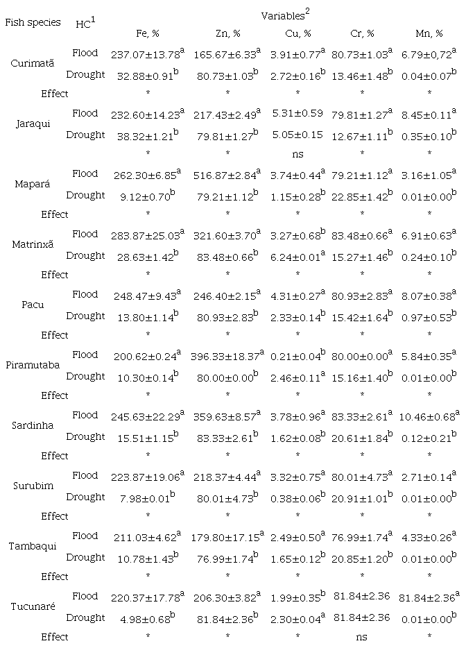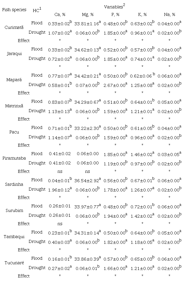 In the minerals composition results, it was observed in the macro minerals content that most Amazon fish species evaluated presented variations in their composition according to the hydrological cycles (Table 3). All species evaluated, except mapará, matrinxã, and surubim, presented Ca values in the fillets higher (p < 0.05) in the drought than in the flood season. It is important to mention that the Ca content of sardinha and surubim was not affected (p > 0.05) by the hydrological cycles.