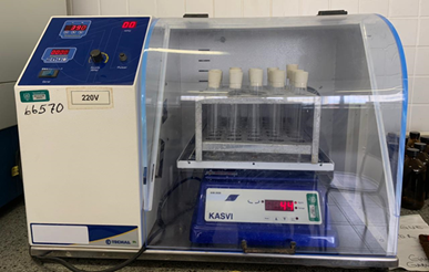 A fistulated Nellore bull grazing on Marandu grass (Urochloa brizantha cv. Marandu) was used as ruminal fluid donor. Ruminal fluid was collected at 7 am, filtered through two cheese-cloth layers and collected in a thermal bottle previously conditioned at 39°C; thereafter, the collected rumen fluid was gassed with CO2. Incubations were performed in 100 mL glass tubes, containing 500 mg (W1) of dried and ground forage and 50 mL of ruminal inoculum (1:4 ruminal fluid: McDougall buffer (McDougall, 1948); pH = 6.9 - 7.2). Each tube was gassed with CO2 and closed with a one-hole rubber cap to regulate internal pressure. Sequentially, the tubes were incubated at 39°C for 48h, using two different heating-stirring systems: i) conventional heating in a thermostatic water bath at 39°C with manual agitation every two hours (Figure 1); and ii) heating in an oven with controlled temperature at 39°C and mechanical agitation at 44 rpm (Figure 2). In each heating-stirring system, nine tubes (three repetitions per forage) were used as incubation systems (experimental unit), totalizing 18 tubes for two heating-stirring systems in each incubation run. Additionally, there were three tubes containing 50-mL inoculum without forage addition (i.e., blank tubes) per incubation run. Two incubation runs were developed in different days.