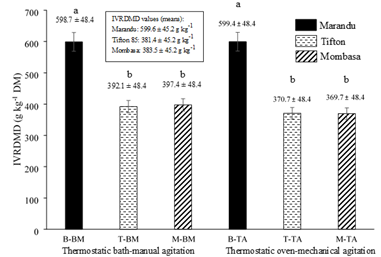 The heating-stirring system did not influence the IVRDMD (P = 0.422; Figure 3). Data revealed that IVRDMD averages determined for Marandu, Tifton 85, and Mombasa grasses using the traditional heating-stirring system were 598.7 ± 48.4, 392.1 ± 48.4, and 397.4 ± 48.4 g kg-1, respectively; whereas those obtained using the alternative heating-stirring system were 599.4 ± 48.4, 370.7 ± 48.4, and 369.7 ± 48.4 g kg-1, respectively (Figure 3). These values indicate that the alternative heating-stirring system produced forage values of IVRDMD statistically equal to those obtained using the traditional heating-stirring system. This condition constitutes as an operational and analytical advantage, as the implementation of an automatic heating-stirring system in the TT method can reduce the working hours of the analyst, as well as reduce the potential errors associated with the determination of IVRDMD of forages in laboratories, due to a reduction of operator intervention in the process.