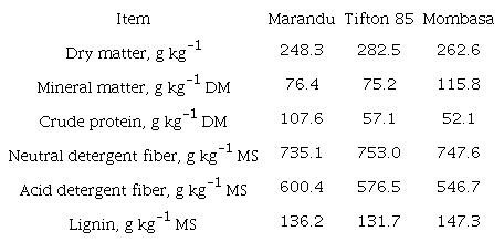 Samples of pre-grazed Marandu (Urochloa brizantha cv. Marandu), as well as of post-grazed Tifton 85 (Cynodon spp. cv. 85) and Mombasa (Megathyrsus maximus cv. Mombasa) forages were collected using the Hand Plucking method (Cook, 1964) in February 2021, at the facilities of the Federal Rural University of the Amazon, Parauapebas Campus, Pará, Brazil (6° 4′25.53″S; 49°48′54.57″W). Forages were dried in a forced-air oven at 55°C for 72h (Solab SL 100/80, Piracicaba-SP, Brazil) and milled (1-mm sieve size; model: #108, De Leo, Porto Alegre-RS, Brazil). Subsequently, dry matter (method: G-003/1), mineral matter (method: M-001/1), crude protein (method: N-001/1), neutral detergent fiber (method: F-001/1), acid detergent fiber (F-003/1), and lignin (F-005/1) contents were determined using the methods proposed by Detmann et al. (2012; Table 1).