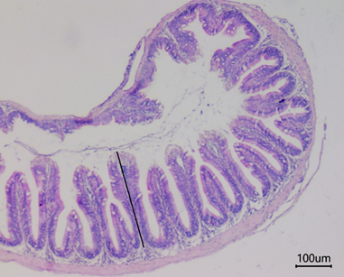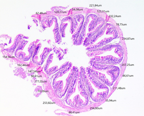Intestinal samples were fixed in neutral buffered formalin at 10%, and stored until processing. Cleavage was conducted, and fragments were placed into histology cassettes for paraffin embedding. The material processing consists of the following steps: sample dehydration in increasing alcohol series (70, 85, 95%, absolute alcohol I, II, and III) during one hour for each sample. After dehydration, samples were cleared in xylol solutions I, II, and III, where they remained for an hour in each concentration. Then, they were immersed in paraffin I and II for an hour in each. Soon after, samples were embedded in paraffin mixed with beeswax, and stored in a freezer at -20°C. Blocks were cross sectioned with a microtome to 4 µm thickness. Slides were stained with hematoxylin and eosin and observed under a light microscope. Villi height was observed and measured with an ocular micrometer (Figure 1).