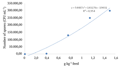 Regarding the recovery of Bacillus sp SMIA-2 from the intestine (Figure 2), its presence was not detected in the treatment in which it was not added to the feed. This demonstrates that there was no contamination of aquaria or feed. Therefore, the bacterium was not present in the system. It was possible to recover the bacterium from the intestine in the other treatments. The number of colony-forming units increased with increasing concentrations of SMIA-2 in the feed. Such results demonstrate their survival ability due to resistance of their spores to gastric and biliary acids. Therefore, they are viable as a probiotic.