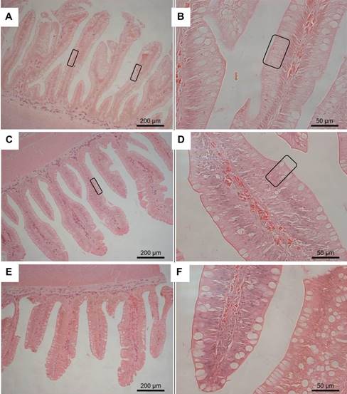 At the end of the trial, eight fish per treatment were sampled for histological analysis of the intestine, hepatosomatic index (HSI) and intestinal coefficient (IC), after fasting for 48 hours. Fish were euthanized in an overdose of eugenol and subsequently dissected to collect the proximal and distal intestine (Rodrigues, Saturnino, & Fernandes, 2017). The tissues were fixed in 4% buffered formalin and subsequently processed for paraffin embedding. Non-sequential 5-µm longitudinal sections were stained with hematoxylin and eosin. The morphological aspect of the distal intestine, as well as the height of the branched intestinal folds (30 measurements per fish, at least) of both segments were analyzed under a light microscope with a digital camera and image analyzer system (Leica DM 2500, Heidelberg, Germany - Baeverfjord & Krogdahl, 1996).