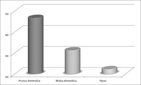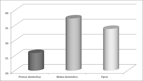 The highest degree of appetite was registered for the leaves and twigs from plum pruning (combined group of two cultivars) - 46.6%, followed by those of the apple - 31.2% and the lowest value was registered for pear species - 22.2%. The total amount of the three types of fodder is accepted as 100%. Compared to the other studied species, the leaf fodder from Prunus domestica had the highest content of crude protein (20.3%), minerals (11.7%), calcium (2.2%), phosphorus (0.6%) and nitrogen (3.2%).