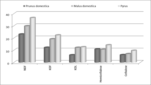 The dry matter obtained after pruning of trees of genus Pyrus registered the highest concentration of neutral and acid-detergent fibers (36.6 and 22.3%), acid-detergent lignin (12.6%) and cellulose (9.7). Pear had the highest concentration of polioside in its dry matter, like hemicellulose (14.2%), which is fully digestible by animals,