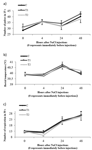 The pulse number, rectal temperature, and respiration number were almost parallel in the groups at any time during the experiment (p > 0.05). There was no treatment and time interaction for pulse number, rectal temperature, and respiration number of the kids. The rectal temperatures, pulse, and respiration numbers of the kids in the present study were almost similar in the groups at all stages. This shows that the ITI of NaCl did not cause impairment in the vital functions of the male kids. These results corroborate the those of the previous study (Neto et al., 2014) which reported that rectal temperature was not affected after ITI of sodium chloride (20%) in calves.