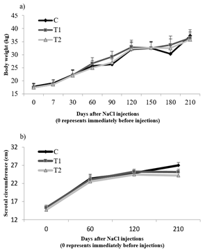 There were no significant differences in body weights among the groups during the experiment (p > 0.05), and there was not an interaction between treatment and time. The ITI of NaCl had no adverse effect on the body weights of the kids both in T1 and T2 groups compared to C animals. There was no group effect on scrotal circumferences of the kids (p > 0.05), and there was not an interaction between treatment and time for scrotal circumferences of the kids.
