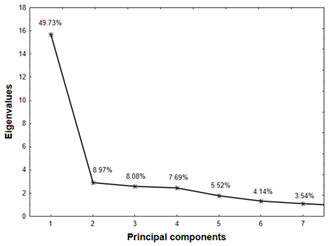 The PCA generated seven principal components (PCs) with eigenvalues > 1, which explained 87.67% total variance (Figure 1). Twenty-five out of the 32 variables analyzed showed greater explanatory power (eigenvector > 0.3 or < -0.3) for some of the generated components.