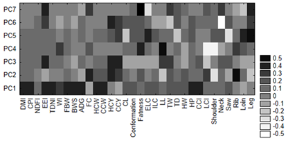The PC1 explained 49.73% total variance, in which DMI, CPI, EEI, TDNI, FBW, BWS, ADG, HCW, CCW, HP, and CCI had the largest eigenvectors (> 0.3) (Figure 2). PC2 explained 8.97% total variability, with the greatest explanatory power for FC, HCY, and rib (eigenvectors > 0.3) and for shoulder (eigenvectors <-0.3). PC3 explained 8.08% total variance, with the greatest explanatory power for EEI, HCY, and CCY (eigenvectors > 0.3). PC4 explained 7.69% total variation, for which fatness and LL (eigenvectors > 0.3) and LCI and shoulder (eigenvectors < -0.4) had greater explanatory power. PC5 explained 5.52% cumulative variance, with ELC, loin, and leg having eigenvectors > 0.3 and CL and saw <-0.3. PC6 explained 4.14% total variance, and neck and HCY had eigenvectors <-0.6 and >0.3, respectively. Finally, PC7 explained 3.54% total variability, with EEI, fatness, and leg showing eigenvectors > 0.3 and ELC < -0.3.