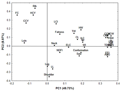 The results verified in PC4 suggest that carcass fatness increase was associated with higher LL. These variables also showed a negative correlation with LCI and shoulder yield. Carcass fatness and LL positive correlation indicates that the ecotype Berganês has long legs and adequate carcass fat cover. Moreover, the high LL was decisive for LCI reduction.
