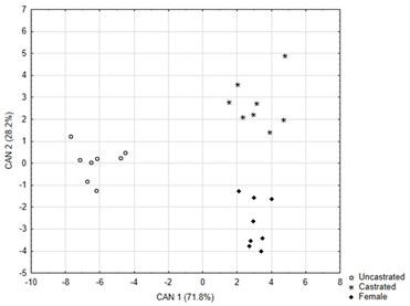 The variables with the highest discriminating power were BWS, TW, TP, fatness, DMI, and HCW (p < 0.05) (Table 4). The remaining others were excluded from the model by Wilks’s lambda stepwise method, with values reducing from 0.183 to 0.028. All lambs could be classified into their respective sex classes (Figure 4).