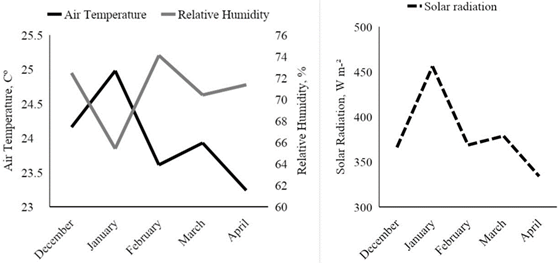 The highest air temperature was recorded in January, with an average of 25°C, high solar radiation (456 W m-2), and low relative humidity (65%). The lowest average temperature (23.2°C), relative humidity (71%), and radiation (334 W m-2) were recorded in April (Figure 2).