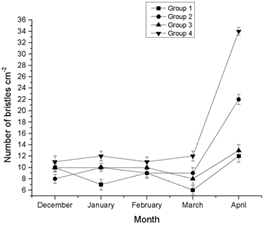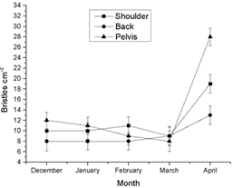 There was a significant increase in bristle density in the three body regions evaluated (p < 0.05) from December to April (Figure 4).