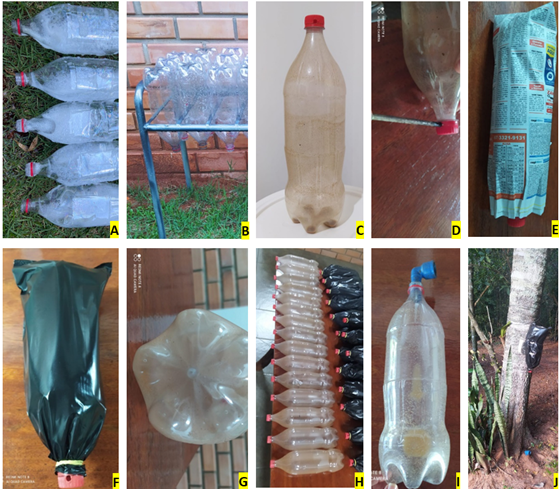 The experiment was conducted in the rural area of the municipality of Campo Grande, state of Mato Grosso do Sul, from May 2022 to September 2022, totaling 120 days. Thirty bait nests were distributed in a randomized block design, with two treatments (A: bait nests set up one meter above the ground, and B: bait nests buried in the ground), with 15 replications per treatment. The bait nests were made using 30 two-liter PET bottles, which were washed with neutral detergent (Figure 1A), rinsed with water (Figure 1B), and, subsequently, had their interior bathed in an attractant made with alcoholic extract of cerumen and propolis from the species Tetragonisca angustula (Figure 1C), simulating the odor of a previously inhabited colony. In treatment A, a hole was made in the cap to allow the bees to enter using a Phillips screwdriver 3/16" X 3" (Figure 1D); the bottles were wrapped in two sheets of newspaper (Figure 1E) and plastic canvas (Figure 1F) to waterproof the trap and ensure a dark interior. In treatment B, five holes were made in the bottom of the bottle with a heated nail (1 ¼ X 15; Figure 1G) so that humidity would not be trapped inside.