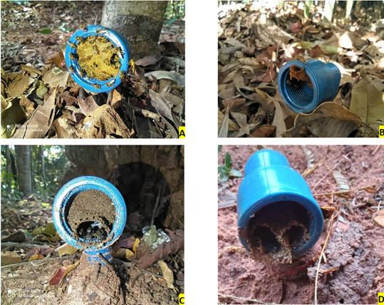 Following the criteria established for the successful capture of the colony in the bait nest, in treatment B (buried in the ground), two baits were nested by jataí (Tetragonisca angustula) 28 and 70 days after the start of the experiment (Figure 2A and B), and two were nested by Mandaguari-preta (Scaptotrigona postica) 28 and 42 days after the start of the experiment (Figure 2C and D). In treatment A (bait set up 1 meter above the ground), there was no success in capturing stingless bee colonies. The position of the bait nest influenced (p < 0.05) the success in capturing stingless bee species, in which treatment B, with the bait buried in the ground, was significantly superior to treatment A, with the bait set up one meter high.