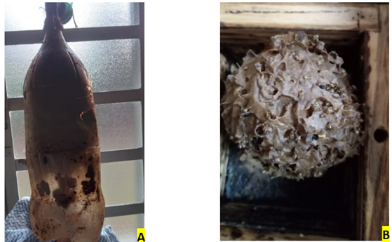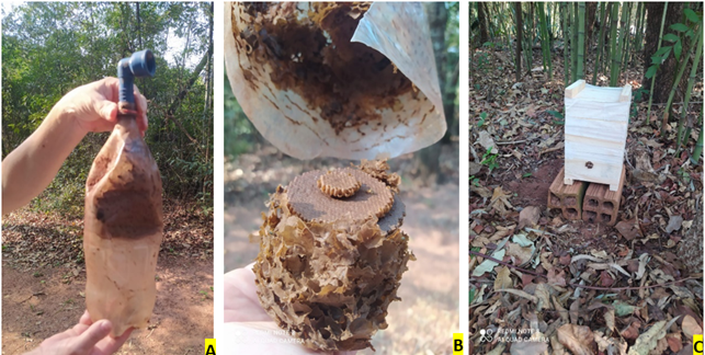Several techniques can be used to produce a bait container, also called a bait bottle or bait nest. Wooden boxes, PET bottles, cardboard packaging, Styrofoam boxes, or other artificial cavities that mimic the natural characteristics of the nest can be used to make it an attractive place for bees to nest (Koser et al., 2020). In nature, bees usually nest in cavities previously used by other bees, which have a characteristic smell resulting from wax and/or batumen remains. Due to this characteristic, an attractant inside the bait nest is commonly used to increase the chances of capturing a swarm.