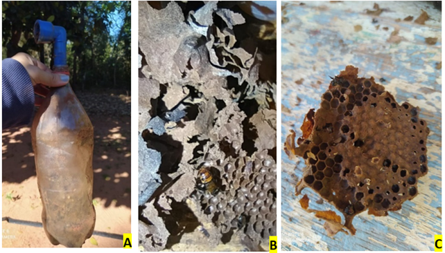 Another factor that must be taken into consideration when capturing using a buried bait nest is humidity x species. The Mandaguari-preta colony, captured after 42 experimental days, faded away 30 days after the start of nesting, due to the occurrence of two days of intense rain. After these events, the movement of bees ceased, and the bait nest was subsequently unearthed. The bottle had water droplets inside and the bottom had approximately 5 cm of accumulated water, with a large number of dead workers. There was nesting material (Figure 5A), wax, food storage pots, and brood cells, and the only live bee found was the queen transiting in the brood area (Figure 5B). Several phorid flies and their larvae were also observed in the brood area (Figure 5C). An alternative to avoid the accumulation of water and excess humidity inside the bait would be to increase the diameter of the holes at the bottle’s bottom and add some material to the bottom of the hole in the ground to allow for water to drain, such as crushed stones, so that the water can drain from the bottle to the ground and not accumulate.