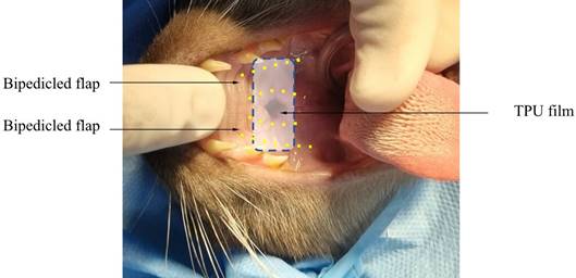 The choice of the surgical technique was based on the sliding bipedicled flap technique, creating two flaps in the palatal mucosa, which overlapped the thermoplastic polyurethane film and were fixed with simple interrupted stitches (Figure 6) (Fossum, 2014).