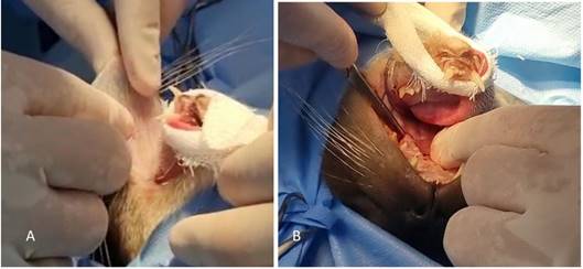 Cleft palate correction in baby animals must be done when they are old enough for safe anesthesia and their tissue has fully matured, which is possible at 45 days of age, when the animal can better tolerate anesthetic risks. Initially, the patient must be fed via a tube, having its nutritional status maintained until it is old enough for surgical procedure (Sousa Filho et al., 2016).