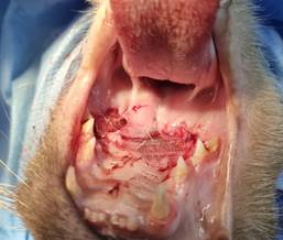 The animal was in good physical condition, with no notable changes in laboratory tests. Its physical examination revealed oronasal communication through a cleft palate located in the caudal region of the hard palate, with an approximate diameter of 8 mm, and the presence of oral and nasal mucopurulent secretion. There was a large amount of fibrotic tissue around the lesion, resulting from previous surgical interventions.