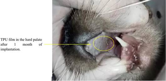 The patient presented a good evolution of the case, without postoperative complications, with spontaneous oral feeding on the same day of the procedure. One month postoperatively, it returned for evaluation, when it was possible to observe the TPU film well adhered to the mucosa, without biofilm growth, color change, odor, inflammatory reaction, or presence of secretions, indicating that the TPU film successfully performed the cleft filling function (Figure 7). After 10 months of follow-up, no changes or complications were observed.
