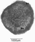In stage XI (Figure 1), on the upper surface of the blastoderm, there is a thin, smooth layer where deeper cells can be seen. In front of the posterior section of the opaque area (ao) is a transparent belt-shaped area whose anterior edge is demarcated by a relatively narrow concentration of horseshoe-shaped cell clusters called Koller's sickle (ks) which, from a morphological point of view, comprises the beginning of the hypoblast.