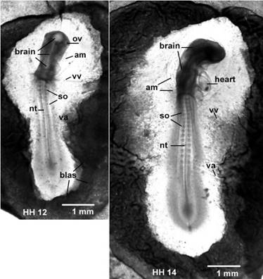 In general, this process of embryonic development in quails is comprised of two phases: inside and outside the breeder. Inside the body of birds, the process begins when the ovum is fertilized in the infundibulum, and then several cell divisions take place. After oviposition, the embryogenic process continues through evolution through the stages of blastula, gastrula, neurula, and organogenesis until the complete formation of the embryo (Persaud & Galef Jr., 2004). Each step of this process was described by Hamburger and Hamilton (1951) in 46 stages.
